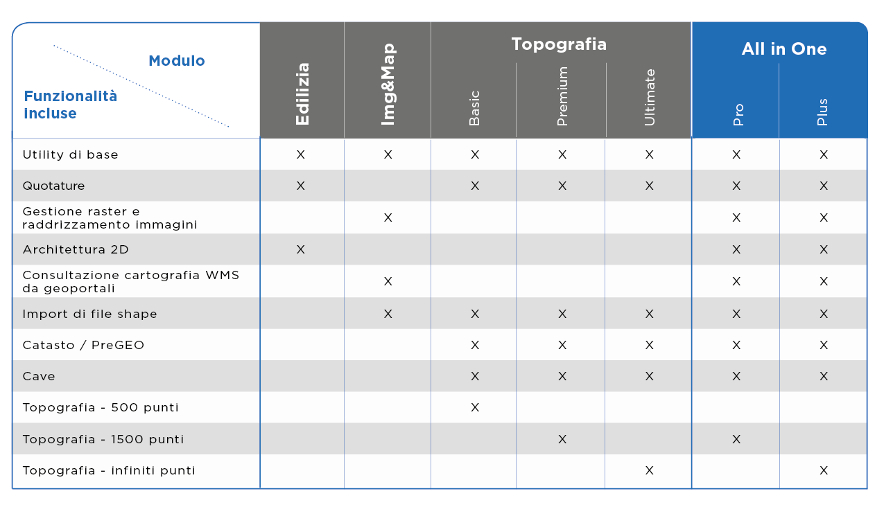 Edilizia, Img&Map e Topografia (Base / Premium / Ultimate) oppure il pacchetto All-in-One che li comprende tutti.